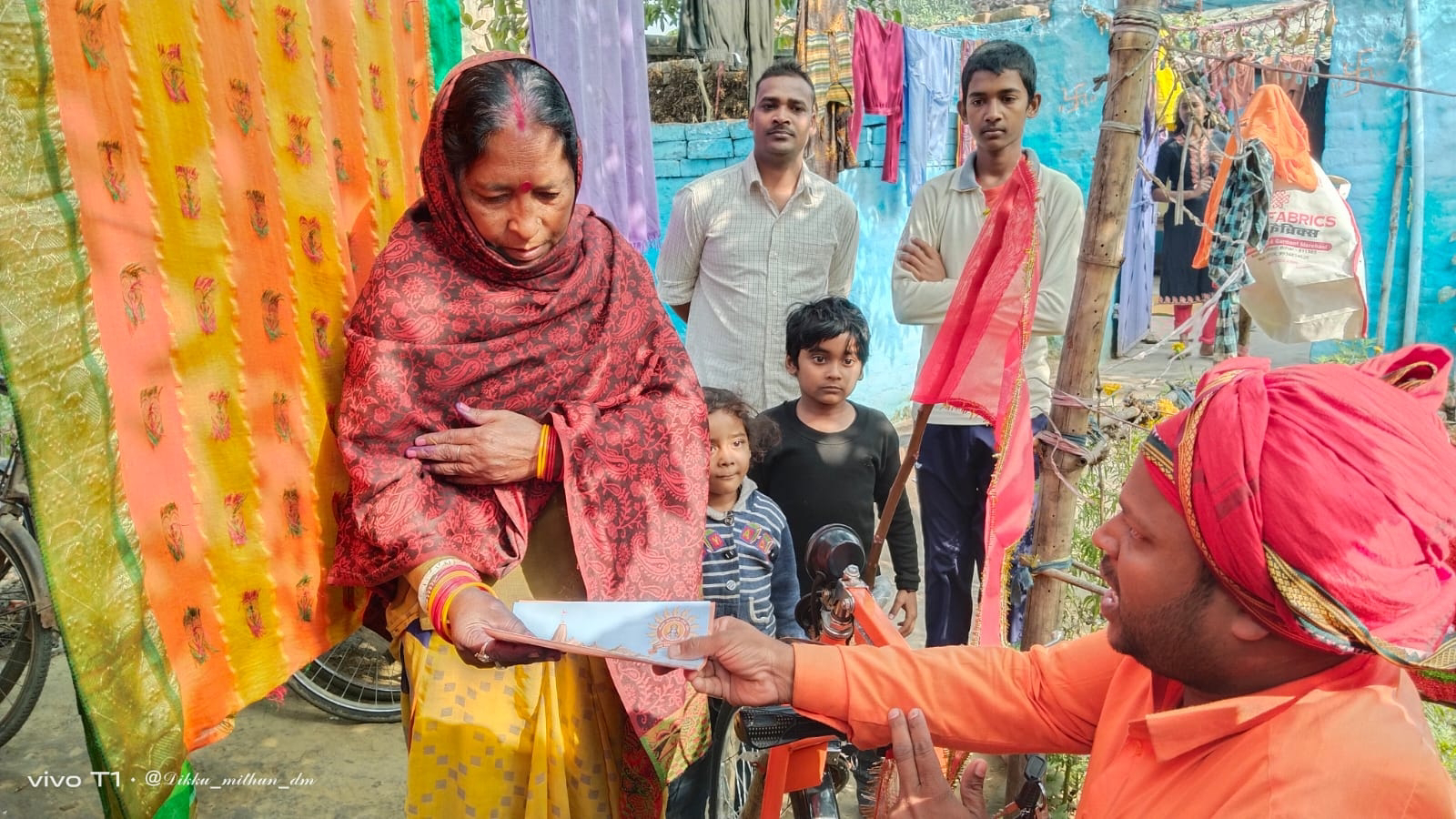 गिद्धौर/जमुई (Gidhaur/Jamui), 16 जनवरी 2024, मंगलवार : गिद्धौर प्रखंड के पतसंडा पंचायत अंतर्गत बनझुलिया गांव में मंगलवार को अयोध्या से आए हुए पूजित अक्षत कलश के साथ श्री राम मंदिर की तस्वीर एवं पर्चे को भव्य जुलूस निकालकर घर-घर अक्षत देते हुए 25 जनवरी के बाद श्री राम जन्मभूमि अयोध्या जाने का निमंत्रण दिया गया।